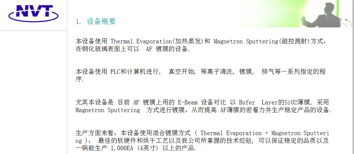 簡述: 本設(shè)備使用 Thermal Evaporation(加熱蒸發(fā))和 Magnetron Sputtering(磁控濺射)方式,在鋼化玻璃表面上可以 AF 鍍膜的設(shè)備.